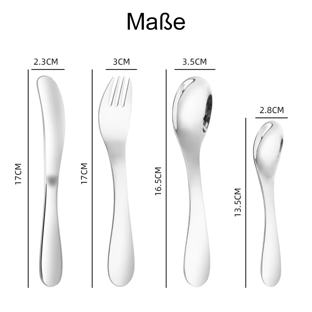 - Passende Größe und Form: Achten Sie darauf, dass das Besteck für das Alter und die Fähigkeiten Ihres Kindes geeignet ist. Wählen Sie Besteck mit abgerundeten Kanten und einem Griff, der gut in kleine Hände passt, um das Risiko von Schnittverletzungen oder Unfällen zu minimieren.