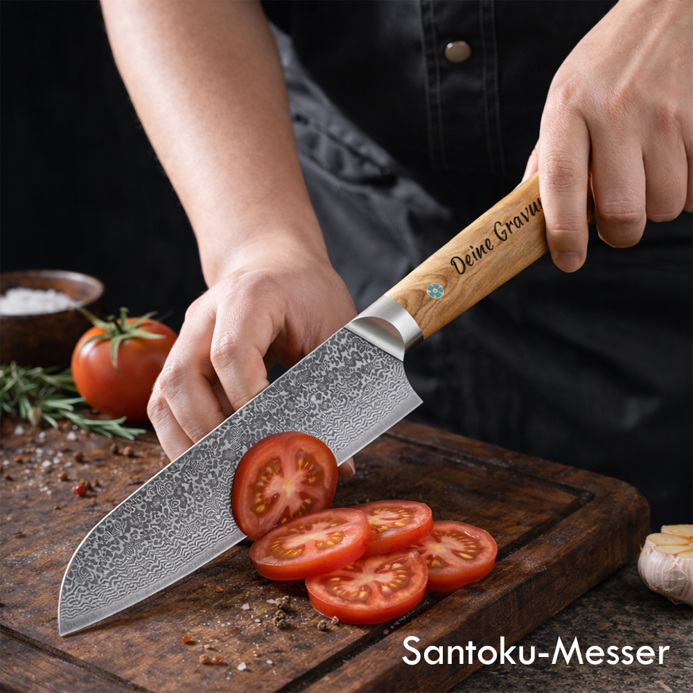 Das Santoku Messer („Drei Tugenden“) steht für höchste Vielseitigkeit in der Küche. Mit seiner breiten, leicht geschwungenen Klinge gleitet es mühelos durch unterschiedlichste Zutaten. Ideal für Hobbyköche wie auch Profis, die Wert auf Balance, Schärfe und Stil legen.