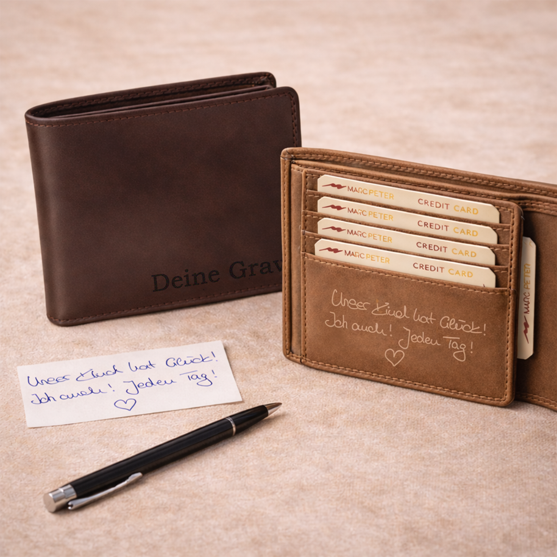 Lass deine Geldbörse gravieren, wie du es gerne hättest. Ob auf der Außenseite durch ein vordefiniertes Gravurlayout, oder auf der Innenseite durch deine persönliche Handschrift oder die ersten Zeichnungsversuche deiner Kinder. Noch persönlicher kann man der beschenkten Person seine Wertschätzung nicht ausdrücken.